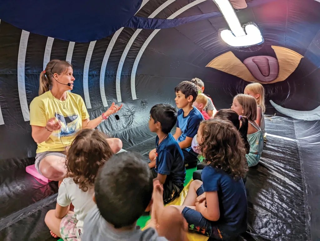 <컴벌랜드 공립 도서관에서 아이들이 고래모빌을 확인하고 있습니다. 사진 제공: 컴벌랜드 공립 도서관.>