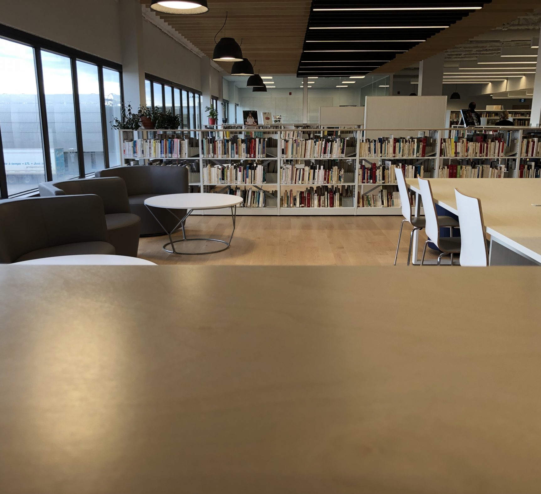 Cégep de Sept-Iles 도서관의 장식으로 사용되는 노란색 카펫, 갈색 가구, 심지어 갈색 벽돌도 사라졌습니다. 이 조용한 곳도 완성! 학생, 교사, 연구원 및 다른 사람들이 만나 정보를 얻거나 전시회를 감상할 수 있는 것은 밝고 빛나는 환경입니다.