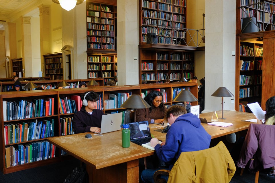 월요일 오후, 나는 컬럼비아에서 가장 상징적인 학습 장소인 버틀러 도서관을 방문했다. 선택할 수 있는 방이 너무 많아 2층에 있는 전형적인 윈 열람실(Wien Reading Room)에서 시작하기로 했다. 단 하나의 좌석을 찾기 위해 통로를 오르내린 끝에, 결국 다른 층으로 이동해야만 했다. 운 좋게 자리를 잡으면 모든 책상에서 충전기를 사용할 수 있고 창문을 통해 자연 채광이 풍부하게 들어온다. 종종 내 자리를 노리는 다른 사람들을 보며 느끼는 사회적 압박감 덕분에 틱톡(TikTok)을 멈추고 실제로 일을 하게 된다. 화려한 장식과 의자 끄는 소리조차 따가운 시선을 받을 만큼 완벽한 정막 덕분에, 미뤄왔던 에세이를 낭만적으로 써 내려가기 쉽다.