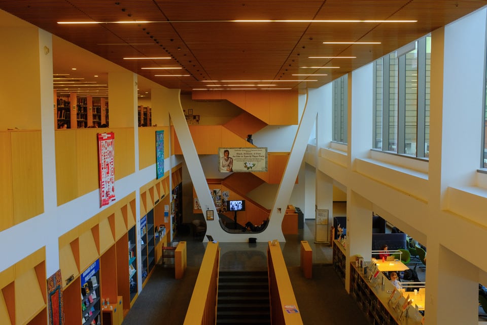 안타깝게도 큰 테이블 근처에는 콘센트가 충분하지 않아 하루 종일 공부하기엔 불편하며, 대부분의 의자에는 의심스러운 얼룩이 있다. 하지만 노코가 모든 면에서 최고일 수는 없다. 내가 머문 한 시간 동안은 일요일이라 자리가 많았지만, 평일이나 기말고사 기간에는 매우 붐빌 수 있다. 이 도서관의 장점 중 하나는 노코 조스(NoCo Joe’s) 카페와 가깝다는 점이다. 공부 중간에 휴식을 취하며 말차를 마시기에 완벽하다. 개인적으로 도서관을 싫어하지만, 노코의 조명, 소음 수준, 전반적인 분위기는 그곳을 견딜 만하게 만든다.